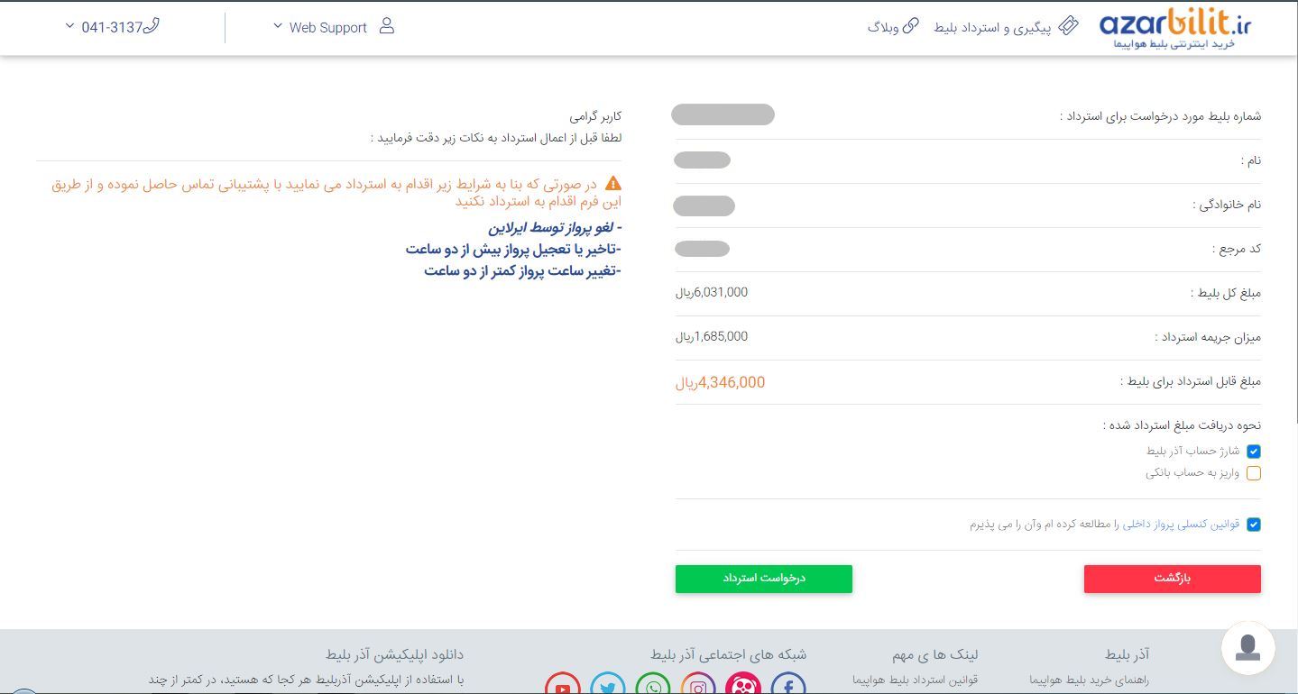 پس از خرید اینترنتی بلیط هواپیما از آذربلیط میتوانید در صورت نیاز بلیط خود را استرداد نمایید. به منظور استرداد آنلاین بلیط هواپیما، فقط کافیست مراحل زیر را طی کنید.